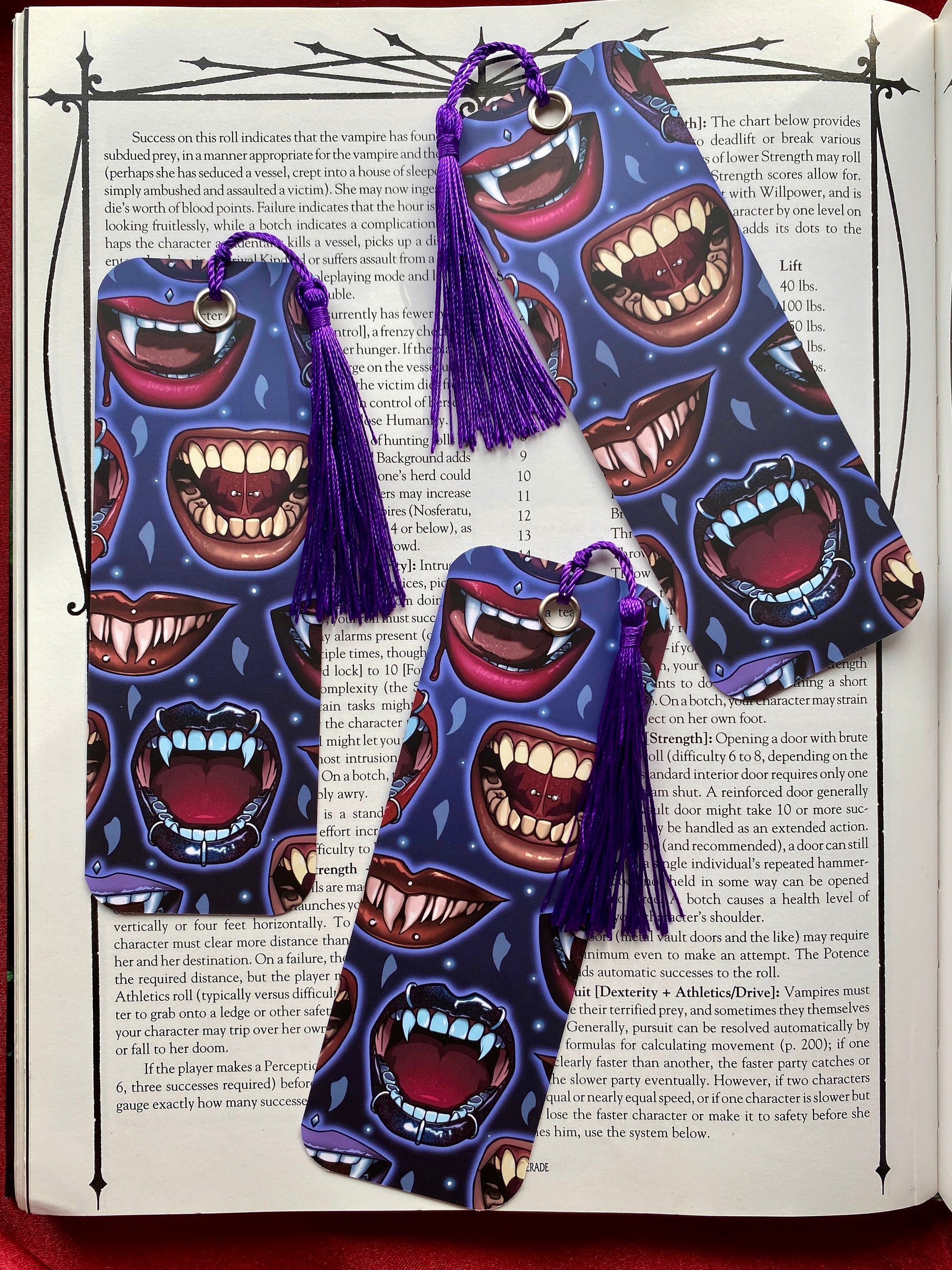 Flash your fangs and flaunt that fiercesome smile with this tassled satin bookmark. Perfect for reminding those local bloodsuckers who's boss.