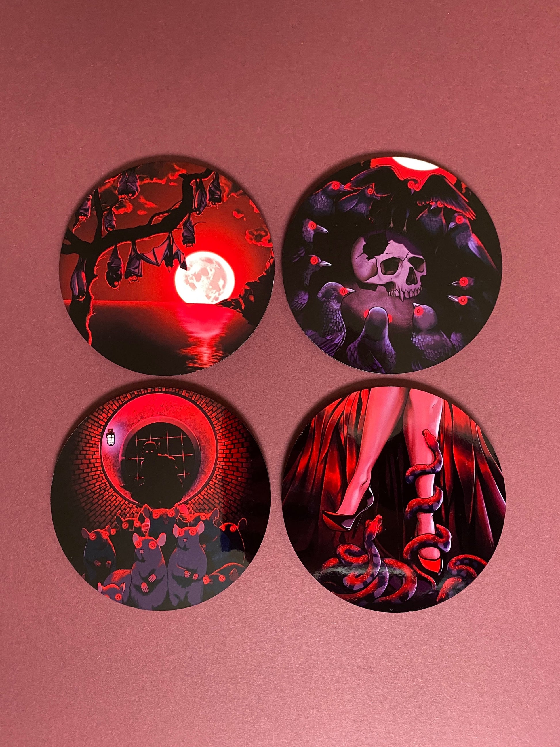 4 designs, available as a set of 4 or as individual coasters: Bats (1), Crows (2), Rats (3), Snakes (4).