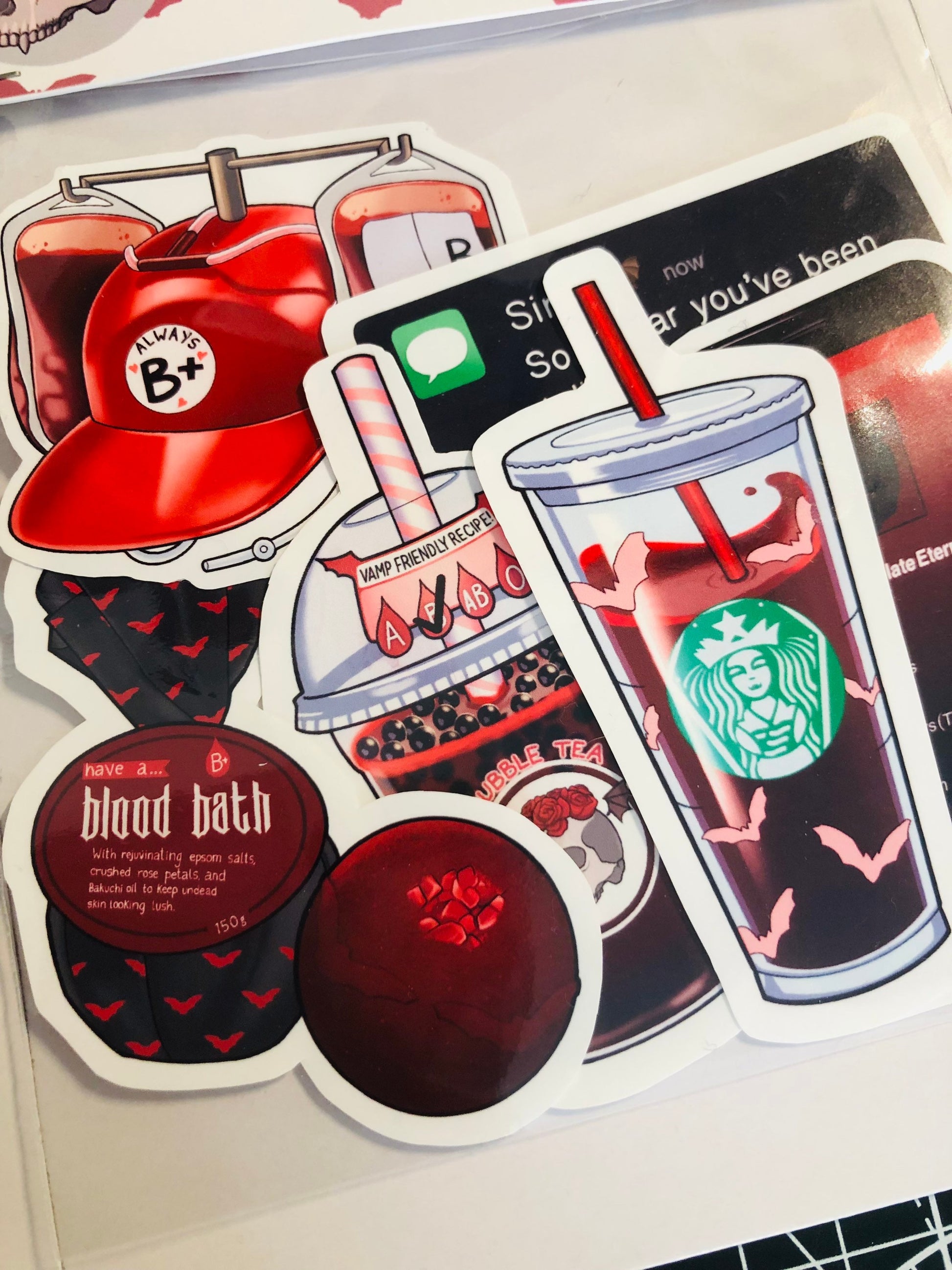 This pack contains 6 modern vampire themed die cut glossy vinyl stickers: