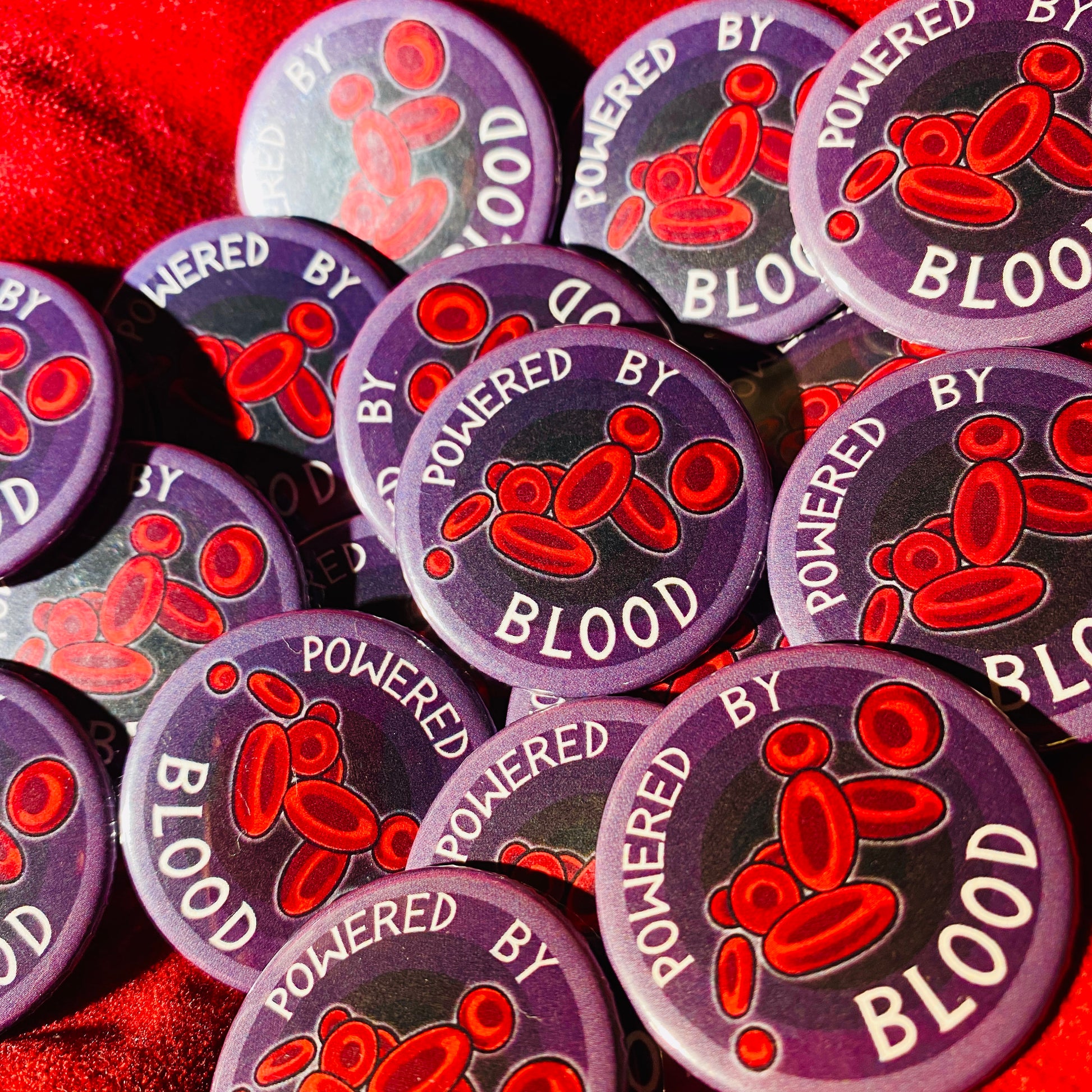 Some are powered by plants. Others? Coffee. But for you, the Powered By Blood button badge will proudly showcase your blood-sucking status.