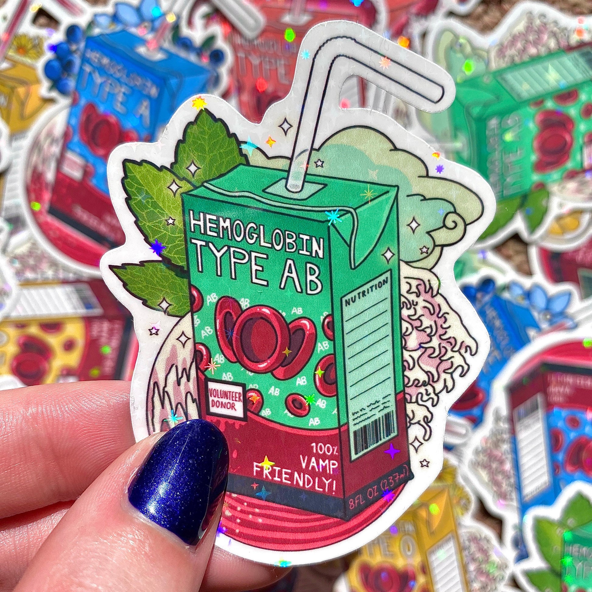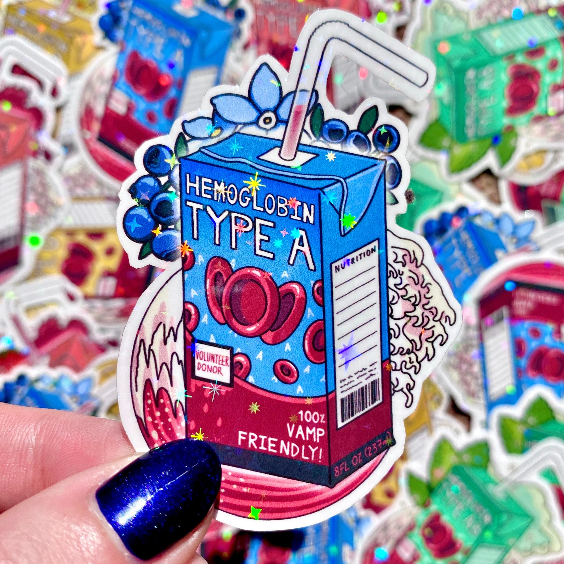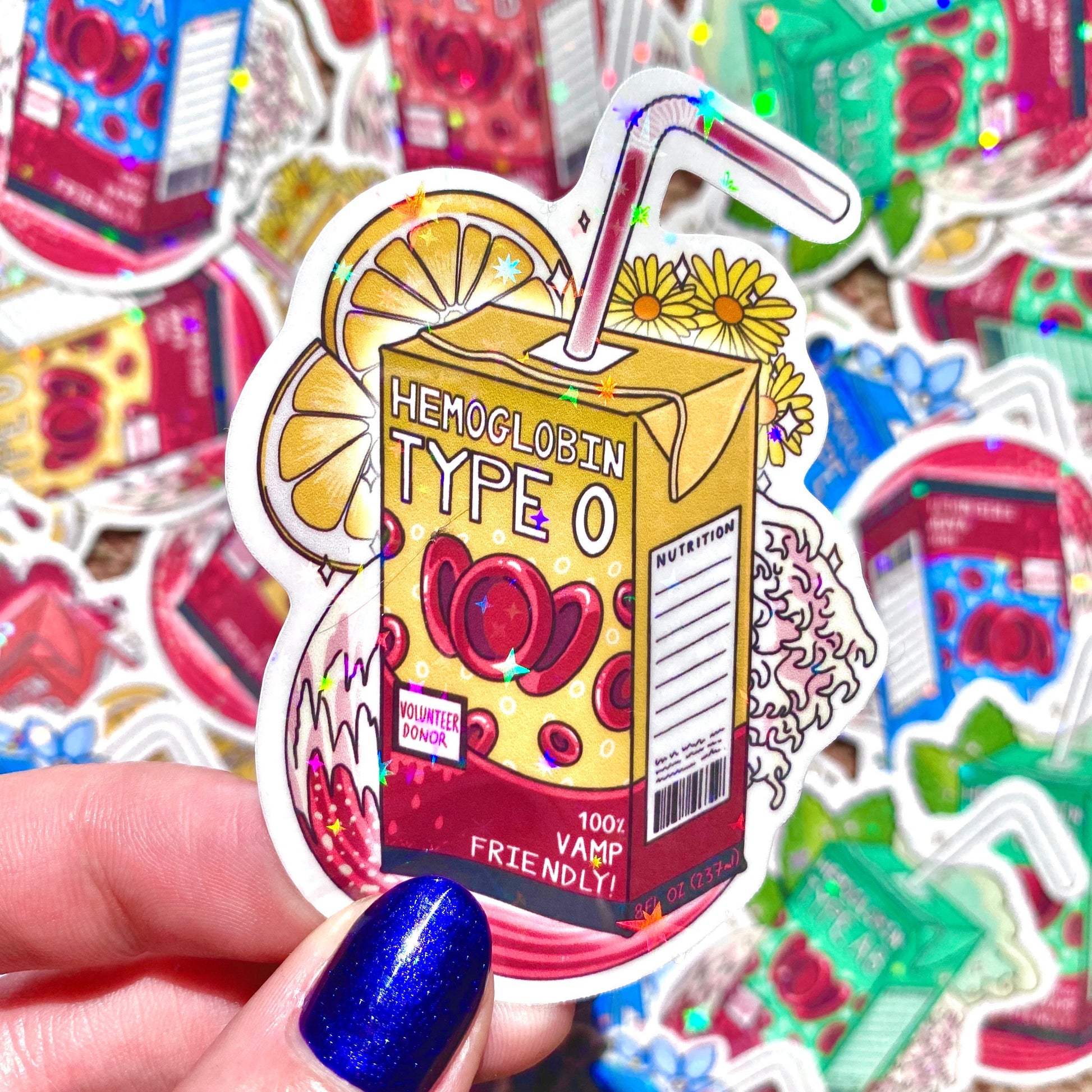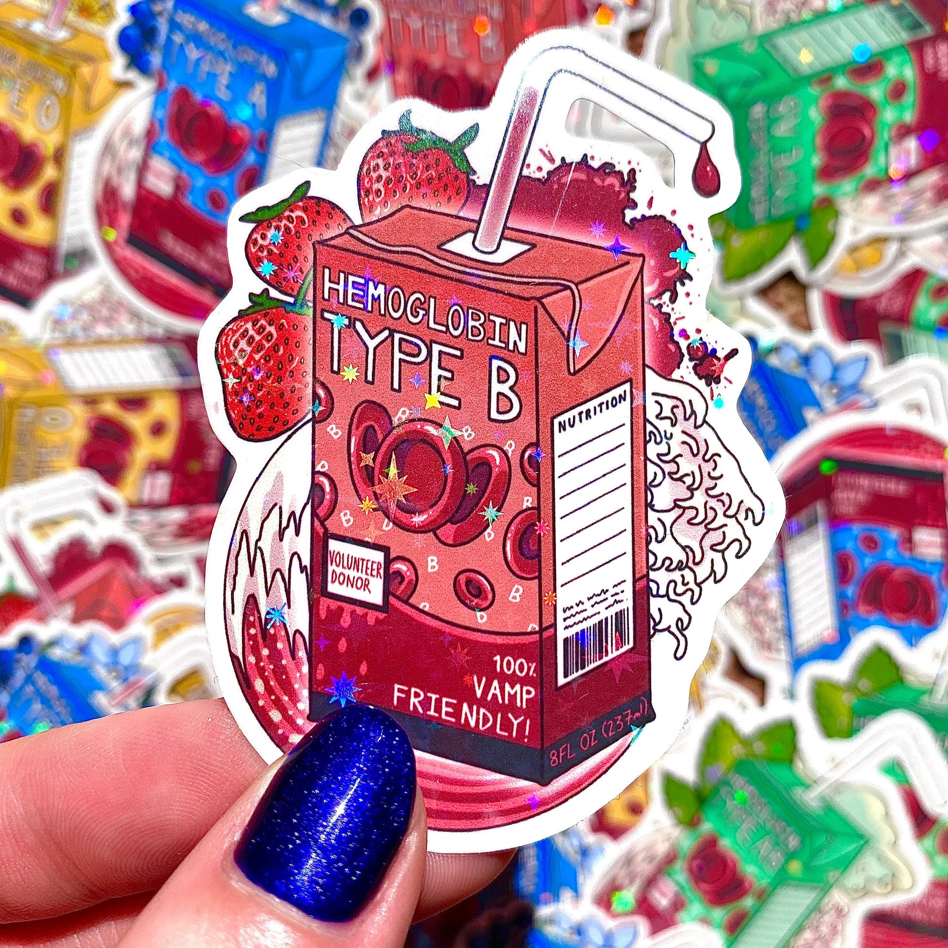 Tired of sating your ancestral thirst the same, boring way? Sick of that same coppery taste? Well, begrudge your eternal existence no more! Try the all new Vampire Juice Box pack! Contains 4 holographic glitter stickers, themed around different flavours.