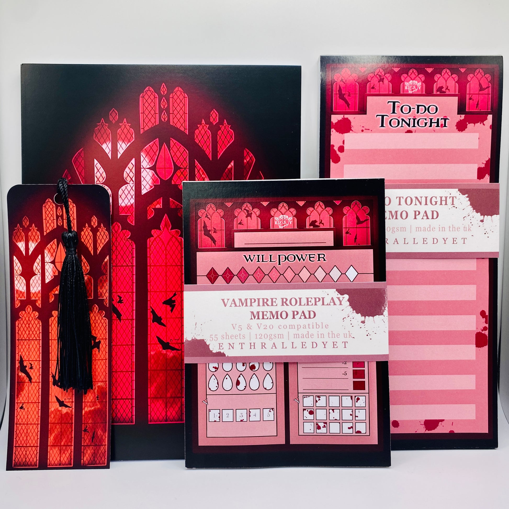 Stop marking up your character sheets and use this sleek, handy memo pad instead! This A6 Vampire Roleplay Memo Pad is able to be used for whichever version you like to play. Be the envy of all the licks at your table!