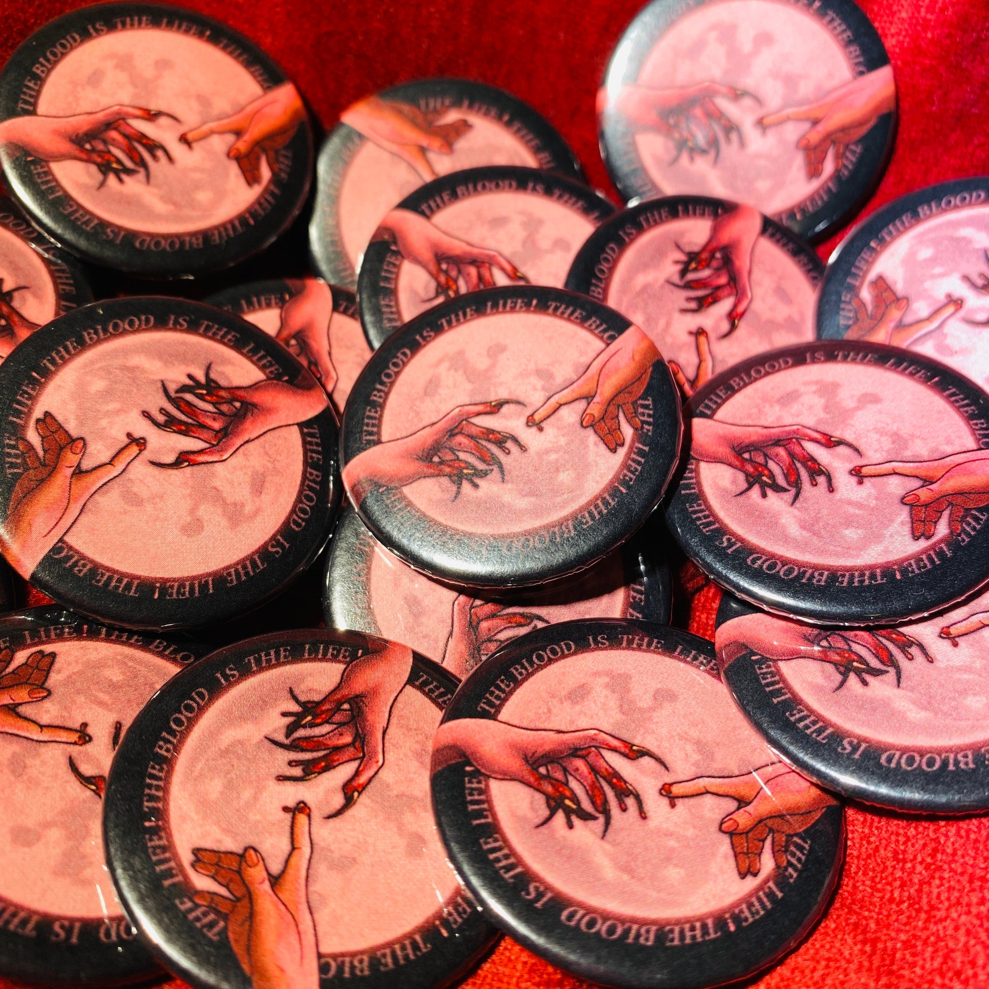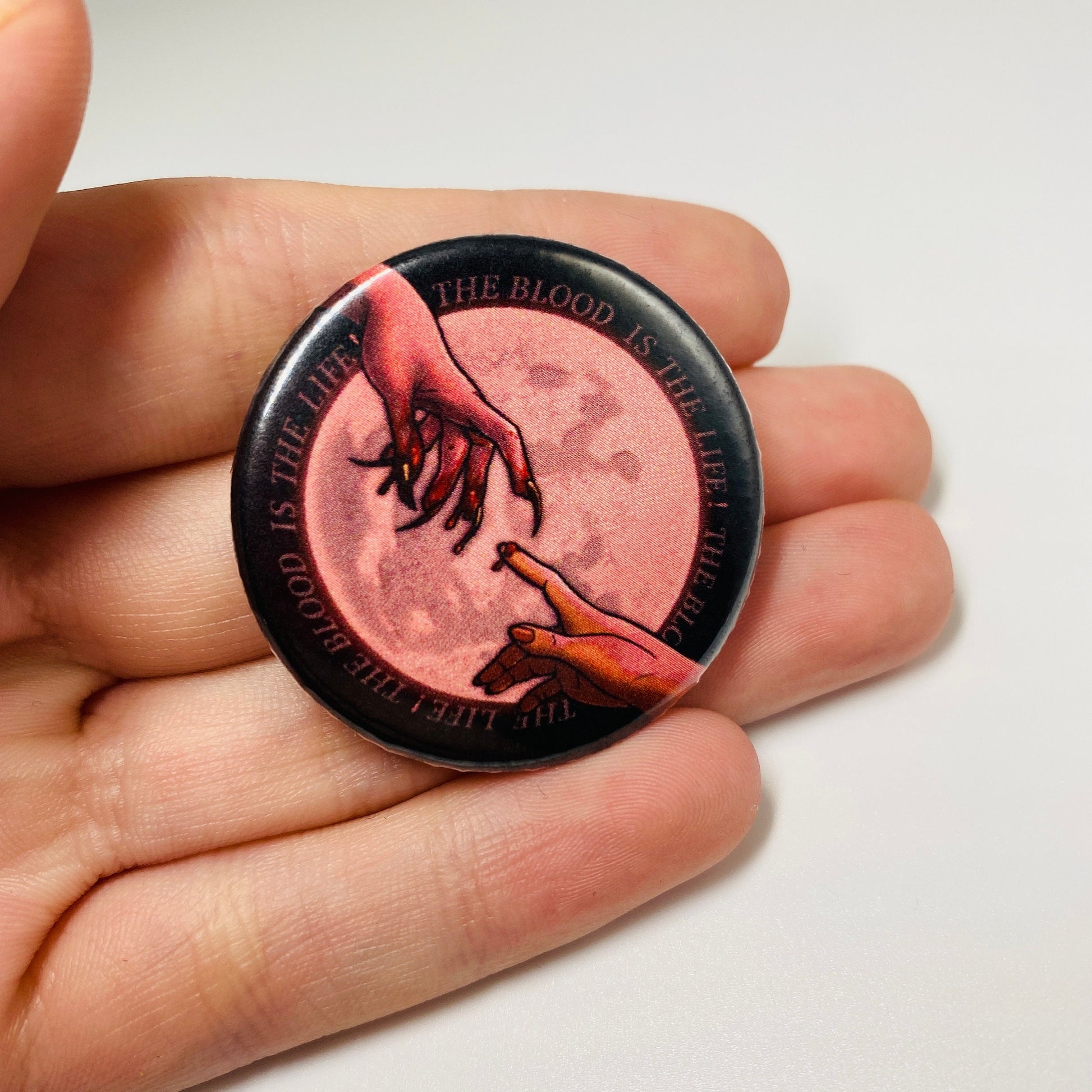 Quoted from Dracula, The Blood Is The Life button badge will proudly showcase your blood-sucking status. Once you look behind the curtain, there's no going back...